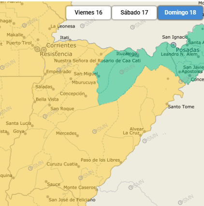 El día domingo, el SMN también emitió alerta amarilla para casi toda la provincia, excepto algunas localidades ubicadas en el noreste como Ituzaingó. Se esperan precipitaciones acumuladas entre 60 y 80 milímetros, con posibilidades de que sea superado en algunos sectores.