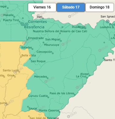 El Servicio Meteorológico Nacional (SMN) emitió una alerta amarilla por tormentas para diferentes ciudades del territorio de la provincia. Para el día sábado se esperan tormentas locales fuertes e intensas lluvias para las localidades ubicadas en el margen oeste del río Paraná, como Bella Vista, Santa Lucía, Goya, Lavalle, Esquina y otras de la región.