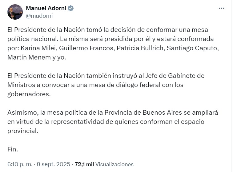 Pasadas las 18 hs de hoy (08/09) el vocero presidencial Manuel Adorni a traves de su cuenta de twitter, informó que “el Presidente de la Nación tomó la decisión de conformar una mesa política nacional”, por el mismo medio indicó que la misma será presidida por el Presidente de la Nación y estará conformada por: “Karina Milei, Guillermo Francos, Patricia Bullrich, Santiago Caputo, Martín Menem y Manuel Adorni”.