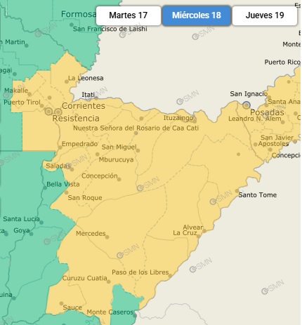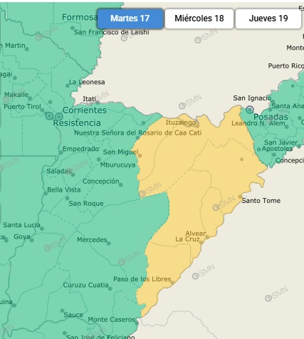 Un nuevo informe del Servicio Meteorológico Nacional anunció que las lluvias intensas y tormentas fuertes seguirán en toda la provincia de Corrientes hasta el jueves. Se informó que las localidades ubicadas sobre la costa del río Uruguay estarán bajo alerta amarilla durante el martes y miércoles. El resto de la provincia fue alertada para la jornada del miércoles 18/06, incluída la capital correntina y alrededores. Las precipitaciones continuarán hasta el día 19/06 y se espera un fin de semana con días soleados y parcialmente nublado.