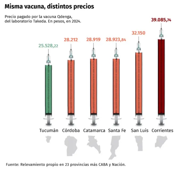 Según un informe sobre compras públicas en salud realizado por Ruido y la Red Federal de Periodismo e Innovación, y publicada en la página Chequeado.com, el Gobierno de Corrientes pagó 39.085 pesos por dosis, siendo la provincia que más caro pagó la vacuna; mientras que Tucumán accedió a este mismo insumo por 25.528 pesos por unidad.
