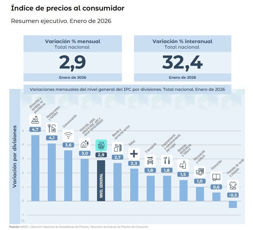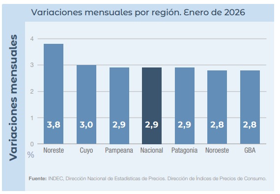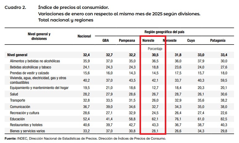 La inflación del mes de enero de 2026 a nivel nacional dio un promedio del 2,9% sumando anualmente un 32,4%. Sin embargo, el promedio de inflación de las cuatro provincias del nordeste argentino estuvo por encima de ese número un 0,9%, es decir que dio un 3,8% promediando en los últimos doce meses 30,5%.