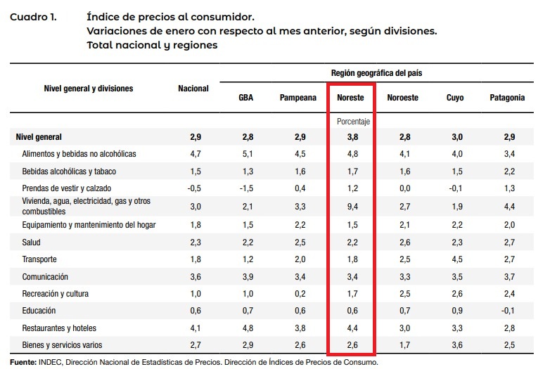 El nordeste argentino compuesto por las provincias de Corrientes, Chaco, Formosa y Misiones es la región del país que más alta inflación tuvo durante el mes de enero, según el cuestionado índice del Instituto Nacional de Estadísticas y Censos (INDEC). El índice del NEA esta casi un punto por encima del promedio nacional, siendo los rubros de “electricidad, gas y otros combustibles” y el de “alquiler de vivienda y gastos conexos”; los que más subieron.