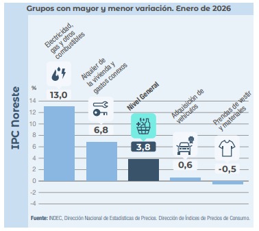En el NEA los rubros que estuvieron por encima del promedio de la región fueron: vivienda, agua, electricidad, gas y otros combustibles 9,4%; alimentos y bebidas no alcohólicas 4,8%; y restaurantes y hoteles 4,4%.