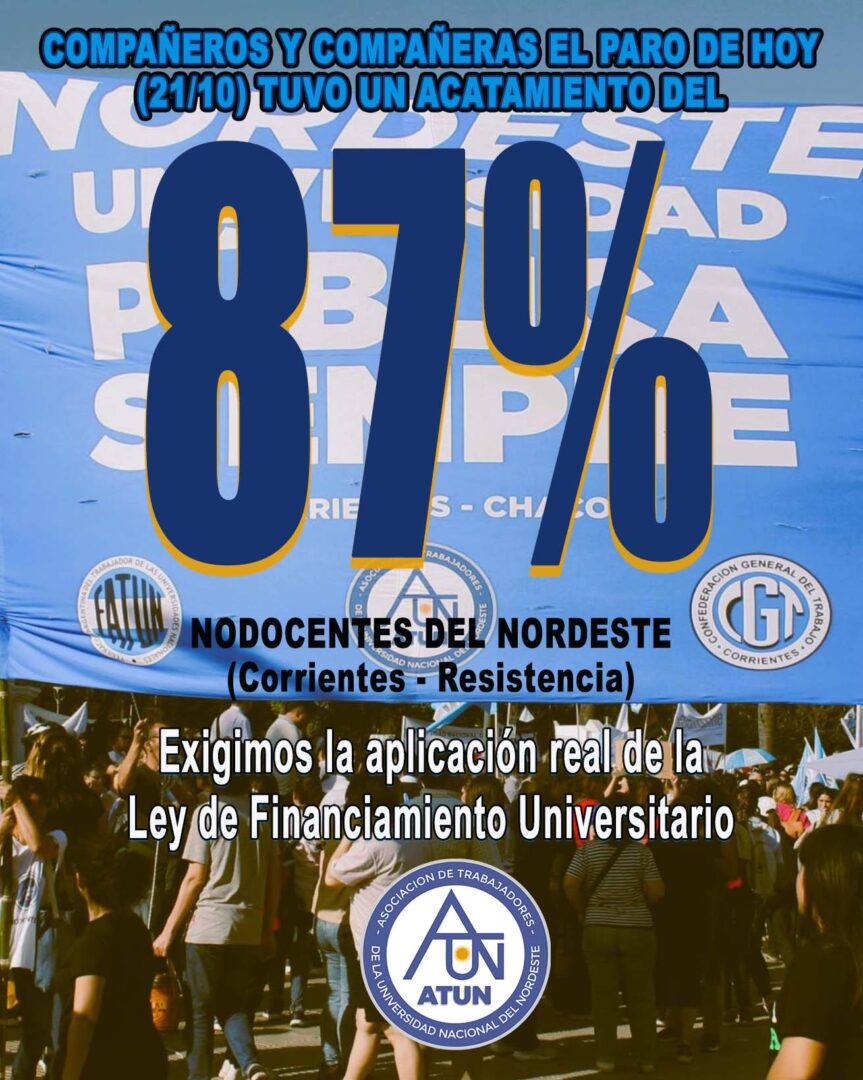 El paro de los trabajadores y trabajadoras no docentes de la Universidad Nacional del Nordeste, tuvo un acatamiento del 87 % a lo largo de toda la jornada de hoy (21/10). “La manifestación de los compañeros y compañeras fue contundente en ambos turnos, tanto en las facultades de Resistencia y como de Corrientes” dijo Liza Hortt, secretaria general de la Asociación de Trabajadores de la Universidad Nacional del Nordeste.