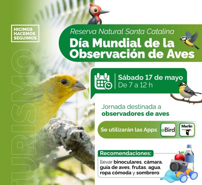 En la ciudad de Corrientes, el sábado 17 de mayo se realizará una jornada de avistaje de aves con acceso y guías gratuitos en la Reserva Natural Municipal Santa Catalina. La actividad se enmarca dentro del Día Mundial de las Aves y el Día Mundial de las Aves Migratorias y será de 7 a 12 horas.