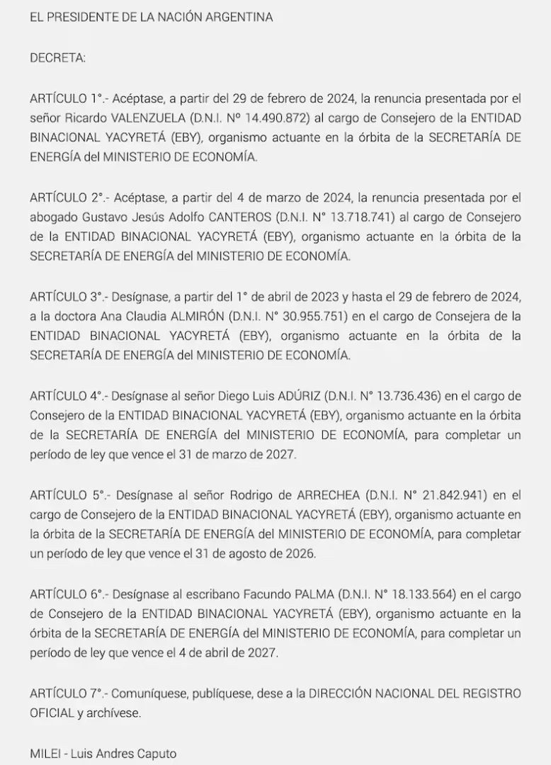 En febrero pasado el presidente Javier Milei nombró al Jefe de Asesores del senador nacional correntino “Camau” Espínola, el dirigente del partido liberal Facundo Palma; como nuevo Consejero en representación de Argentina ante la Entidad Binacional Yacyretá.