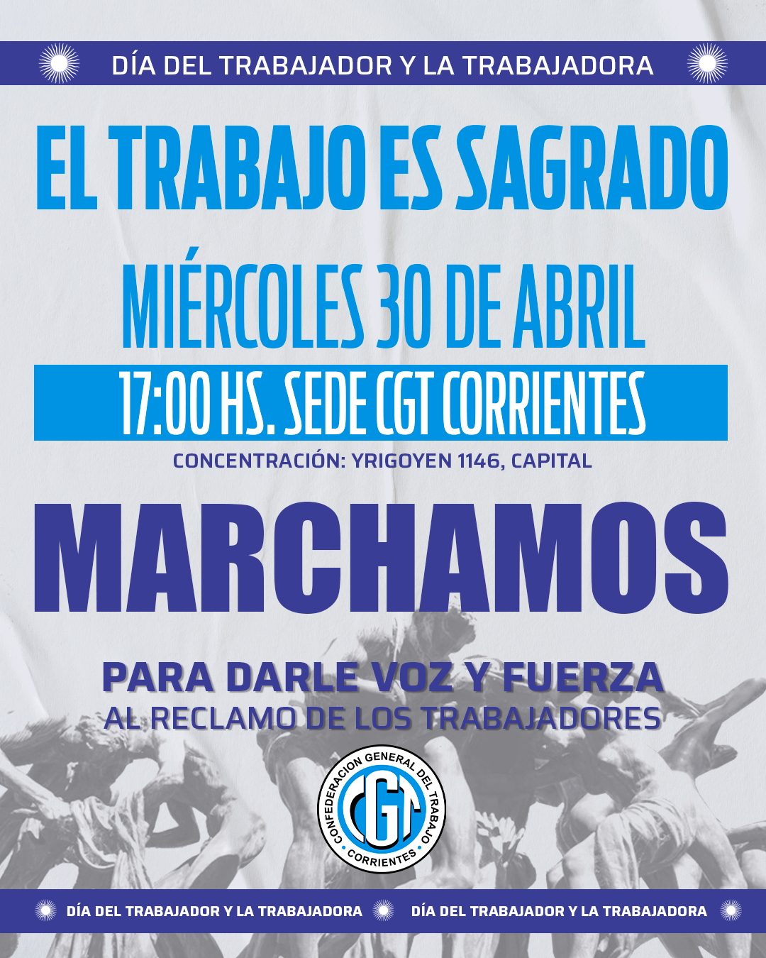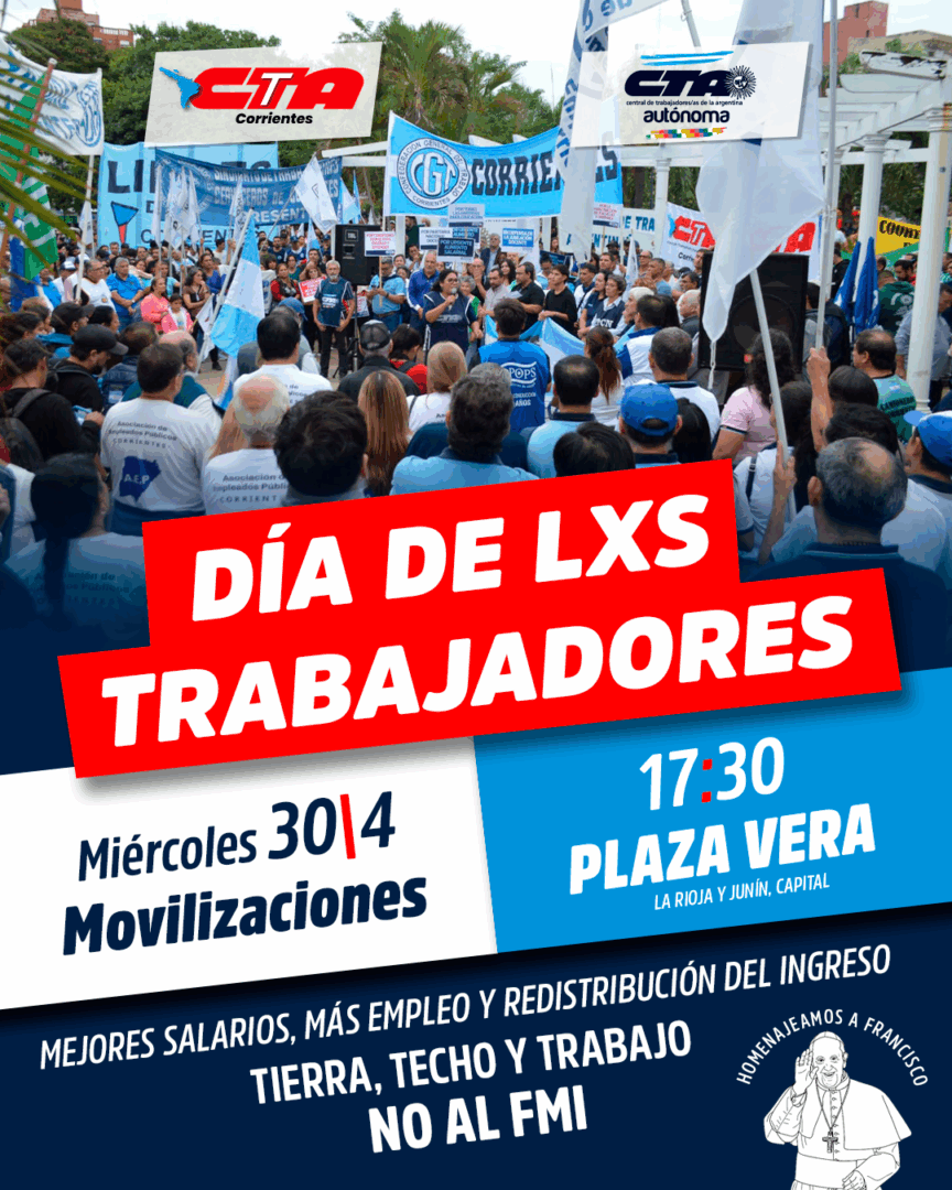El 30/4 en la Ciudad de Corrientes las columnas de trabajadores -del sector público y privado, formales e informales- comenzarán a movilizarse cerca de las 17:00 horas. Saldrán desde distintos puntos y concentrarán en la Plaza Juan de Vera (La Rioja y Junín) a las 17:30 horas. donde se realizará un acto central.