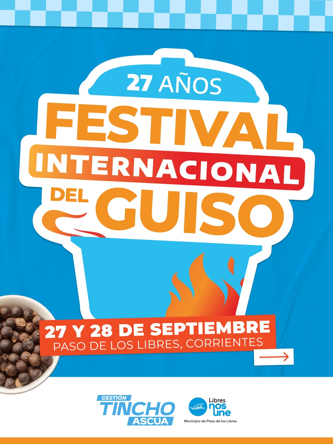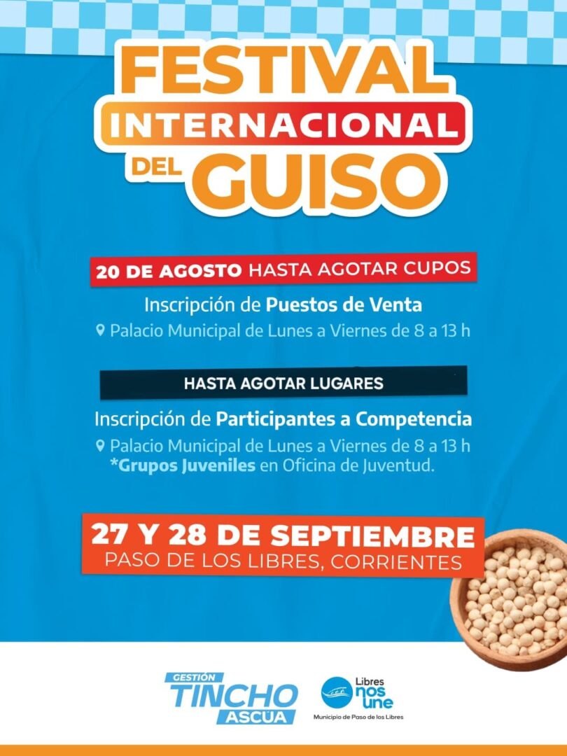 Los días 27 y 28 de septiembre en la ciudad de Paso de los Libres se realizará una nueva edición del Festival Internacional del Guiso y el Municipio informó que se extendió el plazo de inscripciones para competidores. Se pueden realizar de 8 a 13 horas en el Palacio Municipal y en la Dirección de Juventud para grupos juveniles.