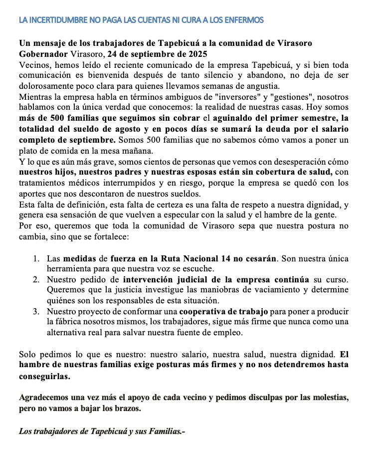 Mediante un nuevo comunicado emitido el miércoles 24/09 y tras la confirmación de la venta de la empresa a un poderoso empresario, expresaron que continúan sin cobertura de salud, sin cobrar el medio aguinaldo de junio, salarios de agosto y “pronto se sumará el de septiembre”.