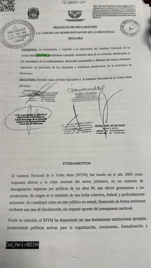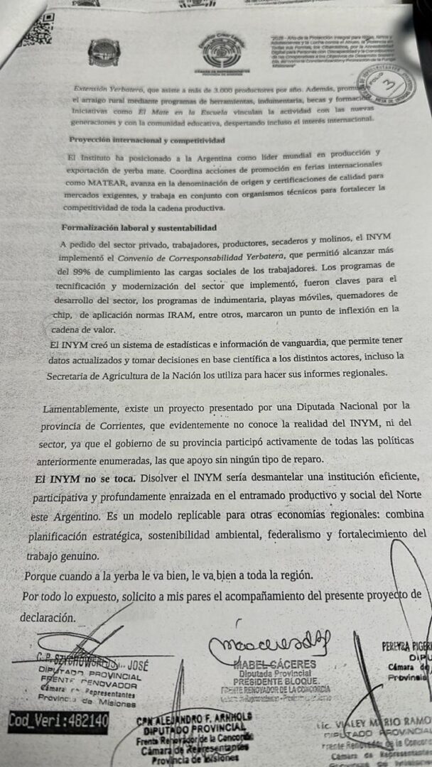 Tras dos semanas de receso por las elecciones legislativas, este jueves 26 sesionó la Cámara de Representantes de la vecina provincia de Misiones. Y uno de los principales temas trataos fue el repudio al Proyecto de Ley que busca cerrar el Instituto Nacional de la Yerba Mate (INYM) que impulsa la diputada nacional de Corrientes, Sofía Brambilla (PRO).