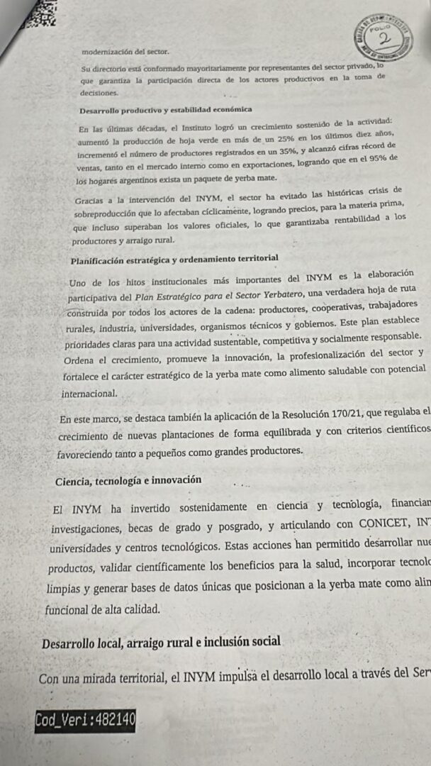 En la sesión de la Cámara, el diputado expuso: “El INYM ha demostrado ser una herramienta pública eficiente, participativa y profundamente transformadora del sector yerbatero argentino”. En la misma intervención explicó que “el INYM se financia con su propia tasa de fiscalización” y remarcó su “modelo institucional para otras economías regionales, ya que combina planificación estratégica, participación del sector privado, gestión territorial y sostenibilidad”.