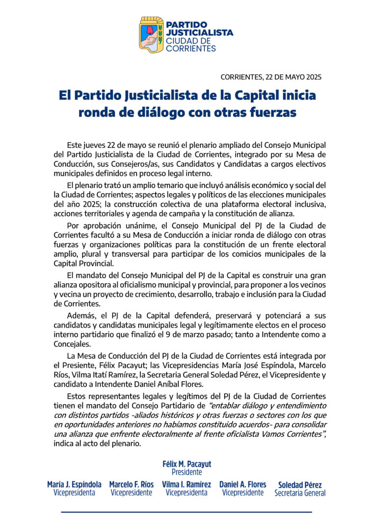 El mandato del Consejo del PJ capitalino es “entablar diálogo y entendimiento con distintos partidos -aliados históricos y otras fuerzas con los que en oportunidades anteriores no habíamos constituido acuerdos- para consolidar una alianza que enfrente electoralmente al frente oficialista Vamos Corrientes”, indica el comunicado.