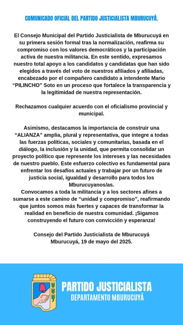 El 19 de mayo el Consejo Municipal del PJ de Mburucuyá aprobó la conformación de una alianza municipal “amplia, plural y representativa que integren todas las fuerzas políticas, sociales y comunitarias”.