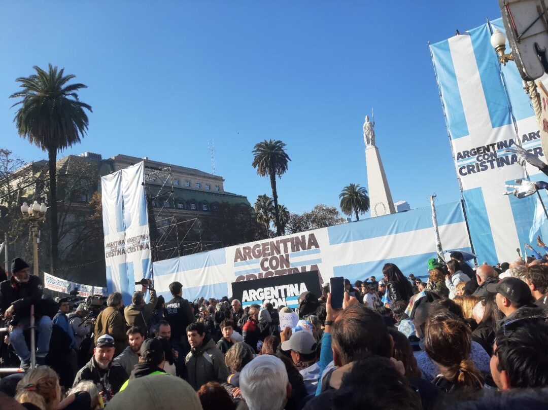 Durante la emisión del ciclo que conducen Luli Trujillo y Rubén Suárez en C5N se transmitieron imágenes en vivo que mostraron la plaza ya completamente ocupada por manifestantes. Con banderas, remeras y cánticos a favor de la exmandataria, el aire de Plaza de Mayo estuvo cargado de consignas en defensa de quien, para los presentes, es víctima de una persecución judicial.