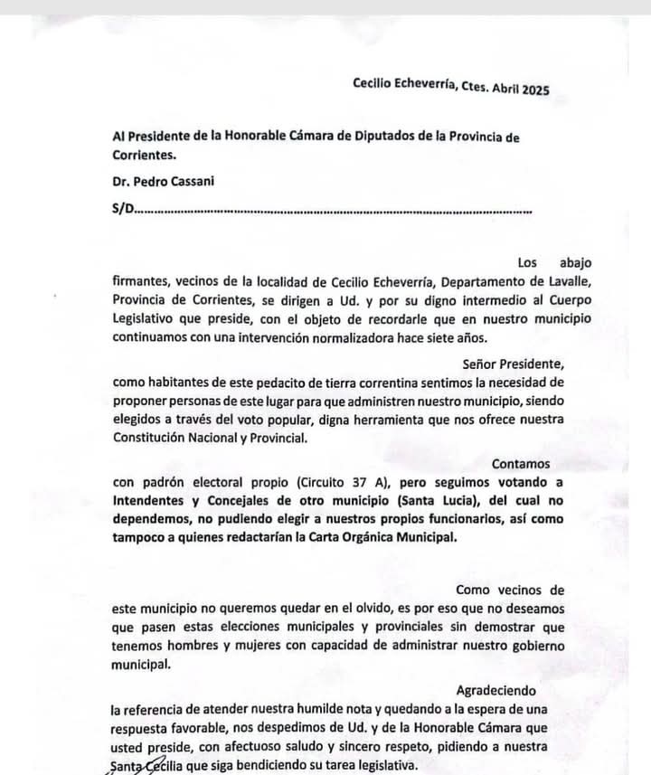 “No pudiendo elegir a nuestros propios funcionarios, así como tampoco a quienes redactarían nuestra Carta Orgánica», expresa la nota enviada a la Legislatura correntina.