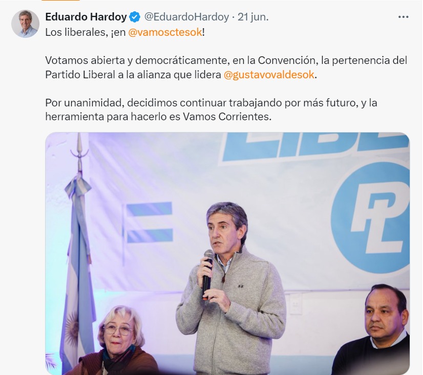“Los liberales, ¡en Vamos Corrientes!” puso en su cuenta de twitter el presidente del partido Eduardo Hardoy, agregando luego que “Votamos abierta y democráticamente, en la Convención, la pertenencia del Partido Liberal a la alianza que lidera Gustavo Valdés”.