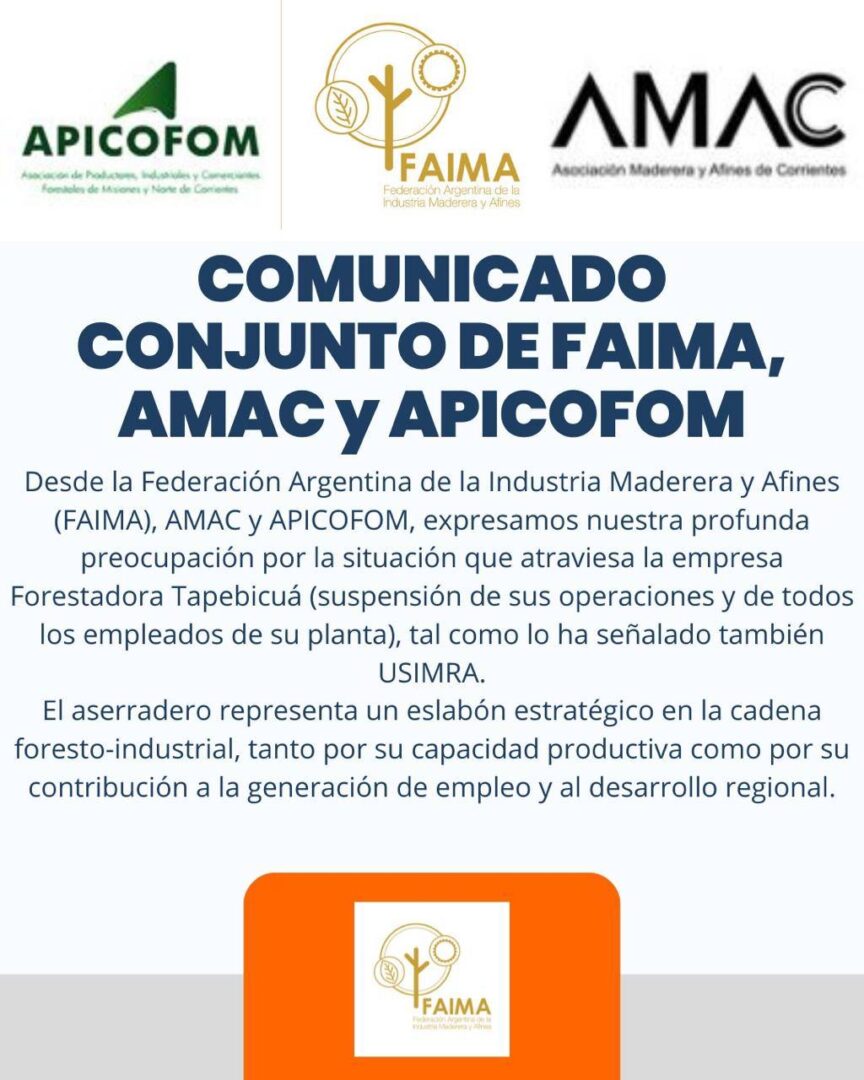 Desde la Federación Argentina de la Industria Maderera y Afines (FAIMA) emitieron un comunicado expresando “nuestra profunda preocupación por la situación que atraviesa la empresa Forestadora Tapebicuá”.