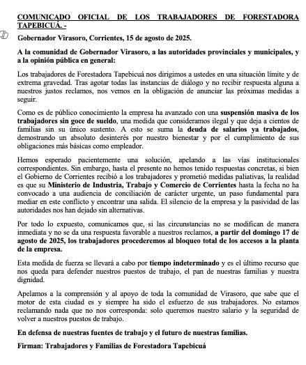 A través de un comunicado firmado por “Trabajadores y Familias de Forestadora Tapebicuá” expresaron que “Hemos esperado pacientemente una solución, apelando a las vías institucionales correspondientes. Sin embargo, hasta el presente no hemos tenido respuestas concretas”. Luego explican que el Gobierno de Corrientes recibió a los trabajadores y “prometió medidas paliativas” pero “la realidad es que su Ministerio de Industria, Trabajo y Comercio de Corrientes hasta la fecha no ha convocado a una audiencia de conciliación de carácter urgente, un paso fundamental para mediar en este conflicto y encontrar una salida”.