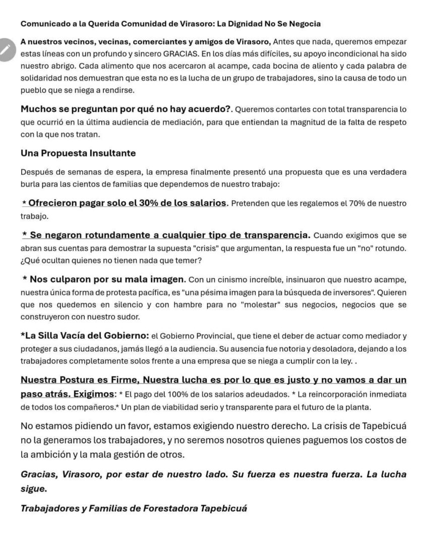 Empleados suspendidos de la planta forestal Tapebicuá, emitieron un comunicado anoche pasadas las 22. Allí cuentan qué pasó para no arribar a un acuerdo con la firma, además, se quejan por la “ausencia del gobierno provincial”, en la mesa de negociaciones. “Jamás llegó a la audiencia” contaron refiriéndose a la reunión en la sede local en Virasoro, de la secretaría de Trabajo. “Su ausencia fue notoria y desoladora dejando a los trabajadores completamente solos frente a una empresa que se niega a cumplir con la ley”.