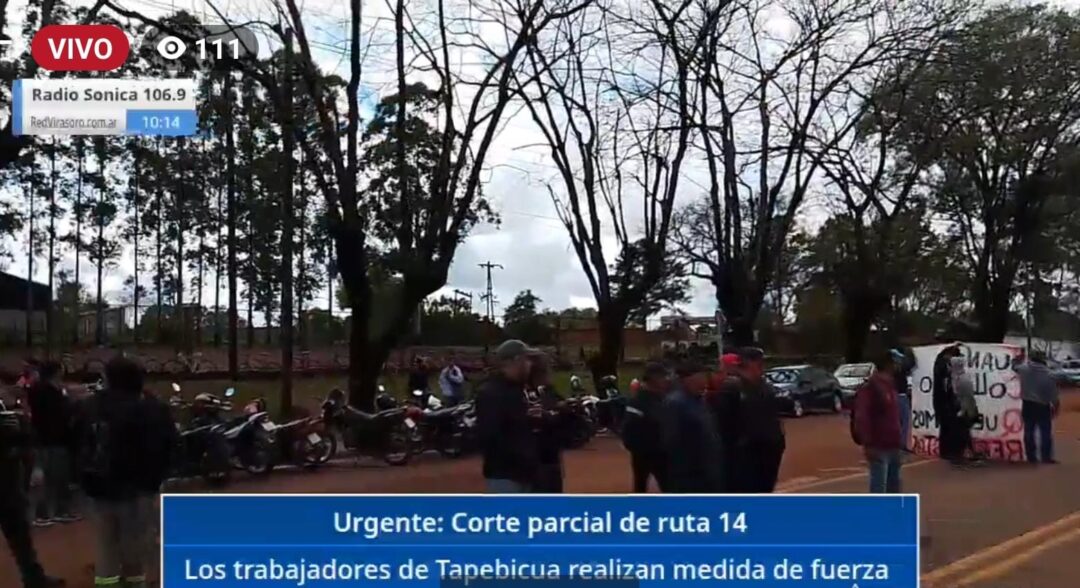 Más de 500 trabajadores suspendidos de la empresa Forestal Tapebicuá, ubicada en Gobernador Virasoro, llevan adelante un corte parcial pacífico de la Ruta Nacional 14 frente a la sede de la empresa. Por la tarde se volvería a cortar una mano de la ruta con el objetivo de visibilizar la situación.